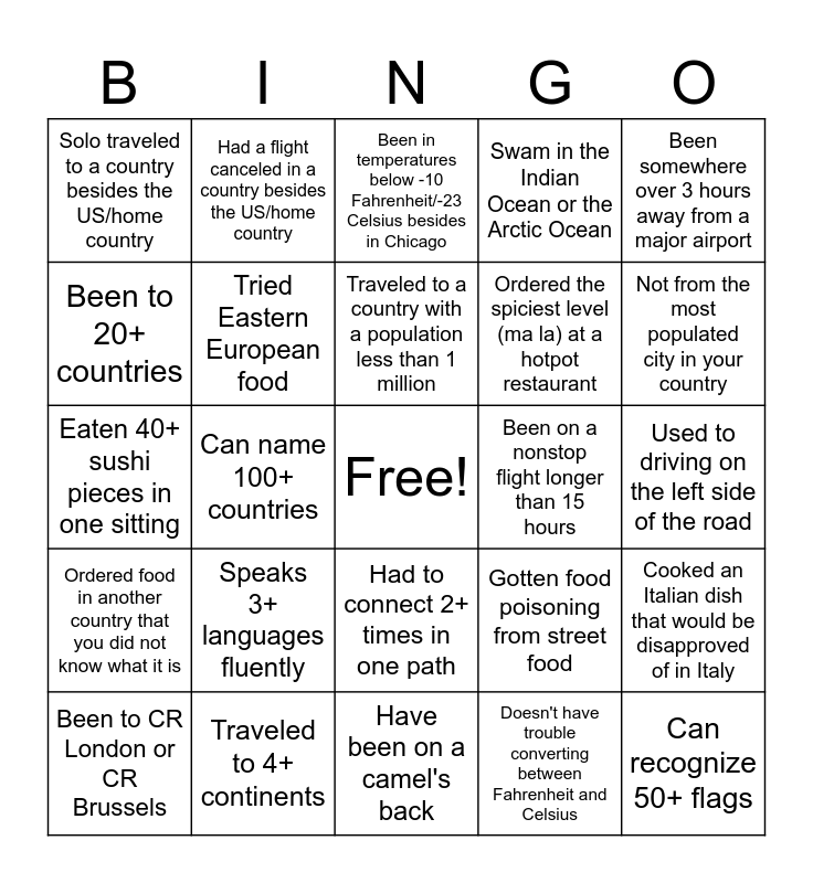 This bingo card has a free space and 24 words: Speaks 3+ languages fluently, Traveled to 4+ continents, Traveled to a country with a population less than 1 million, Been to CR London or CR Brussels, Been somewhere over 3 hours away from a major airport, Solo traveled to a country besides the US/home country, Been to 20+ countries, Had a flight canceled in a country besides the US/home country, Been on a nonstop flight longer than 15 hours, Had to connect 2+ times in one path, Ordered the spiciest level (ma la) at a hotpot restaurant, Eaten 40+ sushi pieces in one sitting, Gotten food poisoning from street food, Cooked an Italian dish that would be disapproved of in Italy, Tried Eastern European food, Doesn't have trouble converting between Fahrenheit and Celsius, Used to driving on the left side of the road, Been in temperatures below -10 Fahrenheit/-23 Celsius besides in Chicago, Not from the most populated city in your country, Can name 100+ countries, Can recognize 50+ flags, Ordered food in another country that you did not know what it is, Swam in the Indian Ocean or the Arctic Ocean and Have been on a camel's back.
