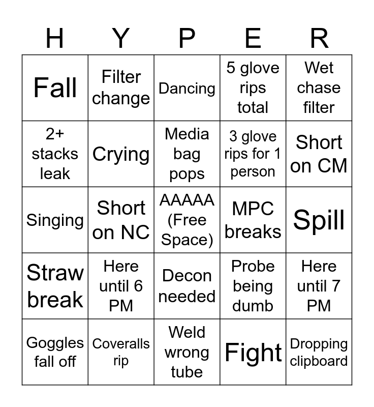 This bingo card has a free space and 24 words: Here until 6 PM, Coveralls rip, Media bag pops, Goggles fall off, Wet chase filter, Fall, 2+ stacks leak, Filter change, MPC breaks, Decon needed, 3 glove rips for 1 person, Singing, Probe being dumb, Here until 7 PM, Crying, Fight, Spill, Dancing, Short on CM, Short on NC, Dropping clipboard, Straw break, 5 glove rips total and Weld wrong tube.