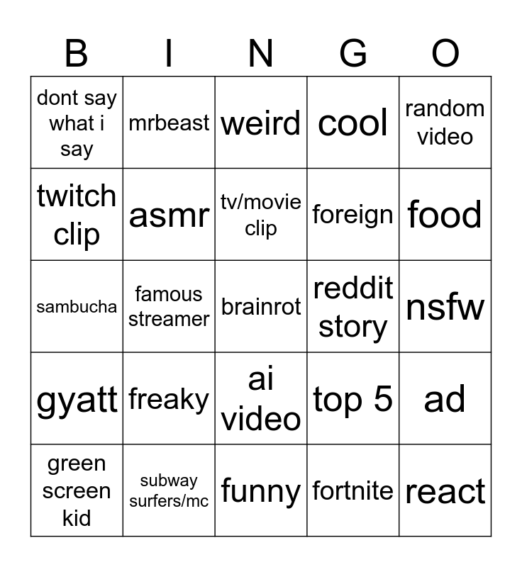 This bingo card has a free space and 24 words: freaky, subway surfers/mc, tv/movie clip, green screen kid, random video, dont say what i say, twitch clip, mrbeast, reddit story, ai video, foreign, sambucha, top 5, ad, asmr, fortnite, nsfw, weird, food, famous streamer, react, gyatt, cool and funny.