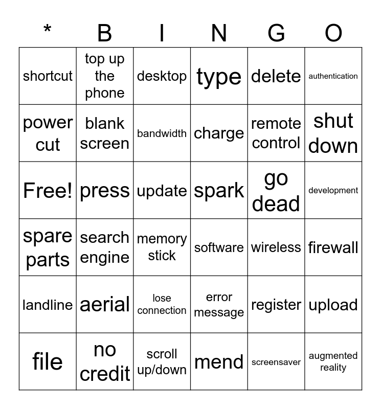This bingo card has 36 words: error message, lose connection, mend, power cut, spare parts, spark, blank screen, scroll up/down, delete, register, shut down, type, upload, press, charge, shortcut, landline, go dead, Free!, desktop, update, search engine, software, memory stick, wireless, top up the phone, remote control, no credit, bandwidth, authentication, augmented reality, file, firewall, development, aerial and screensaver.