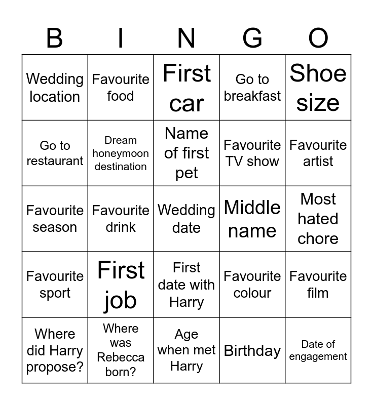 This bingo card has 25 words: First job, Age when met Harry, Name of first pet, Where did Harry propose?, Shoe size, Wedding location, Go to restaurant, Favourite food, Middle name, First date with Harry, Favourite TV show, Favourite season, Favourite colour, Favourite film, Dream honeymoon destination, Date of engagement, Most hated chore, First car, Favourite artist, Favourite drink, Wedding date, Where was Rebecca born?, Favourite sport, Go to breakfast and Birthday.