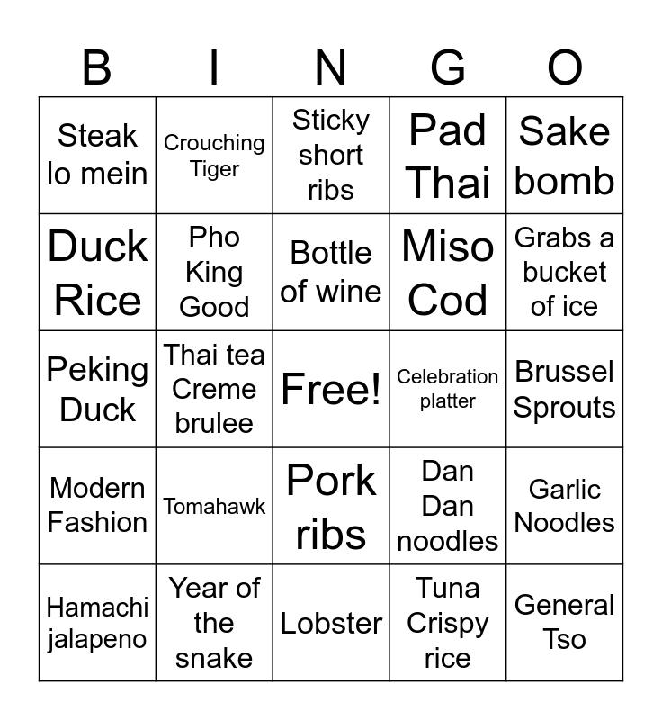 This bingo card has a free space and 24 words: Tomahawk, Year of the snake, Bottle of wine, Hamachi jalapeno, Sake bomb, Steak lo mein, Duck Rice, Crouching Tiger, Celebration platter, Pork ribs, Miso Cod, Peking Duck, Dan Dan noodles, Garlic Noodles, Pho King Good, Tuna Crispy rice, Brussel Sprouts, Sticky short ribs, Grabs a bucket of ice, Thai tea Creme brulee, General Tso, Modern Fashion, Pad Thai and Lobster.