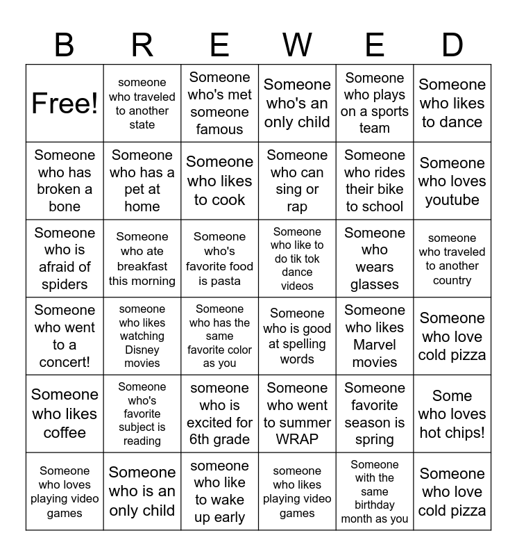 This bingo card has 37 words: Someone favorite season is spring, Someone who went to summer WRAP, Someone with the same birthday month as you, Someone who has broken a bone, someone who likes watching Disney movies, Someone who wears glasses, Someone who has a pet at home, someone who likes playing video games, Someone who plays on a sports team, Someone who loves playing video games, Someone who loves youtube, Someone who's an only child, Someone who is afraid of spiders, Someone who's favorite food is pasta, Someone who likes to dance, Someone who like to do tik tok dance videos, Someone who's favorite subject is reading, Someone who's met someone famous, someone who traveled to another country, Someone who ate breakfast this morning, Free!, Someone who can sing or rap, Someone who has the same favorite color as you, Someone who likes Marvel movies, Someone who is an only child, Someone who love cold pizza, someone who traveled to another state, someone who like to wake up early, Some who loves hot chips!, someone who is excited for 6th grade, Someone who stayed home and chilled, Someone who is good at spelling words, Someone who rides their bike to school, Someone who likes coffee, Someone who went to a concert!, Someone who likes to cook and Someone who love cold pizza.