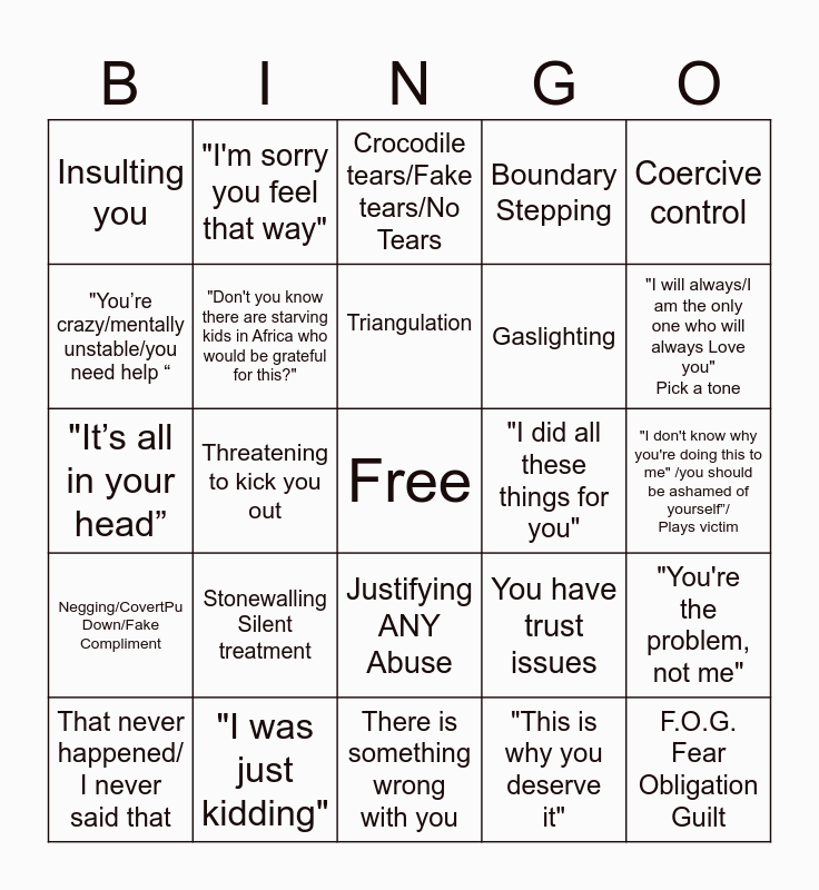 This bingo card has a free space and 24 words: Stonewalling Silent treatment, "I was just kidding", Triangulation, That never happened/ I never said that, Coercive control, Insulting you, "You’re crazy/mentally unstable/you need help “, "I'm sorry you feel that way", "I did all these things for you", Justifying ANY Abuse, Gaslighting, "It’s all in your head”, You have trust issues, "You're the problem, not me", "Don't you know there are starving kids in Africa who would be grateful for this?", "This is why you deserve it", "I don't know why you're doing this to me" /you should be ashamed of yourself”/ Plays victim, Crocodile tears/Fake tears/No Tears, "I will always/I am the only one who will always Love you" Pick a tone, Threatening to kick you out, F.O.G. Fear Obligation Guilt, Negging/CovertPu Down/Fake Compliment, Boundary Stepping and There is something wrong with you.
