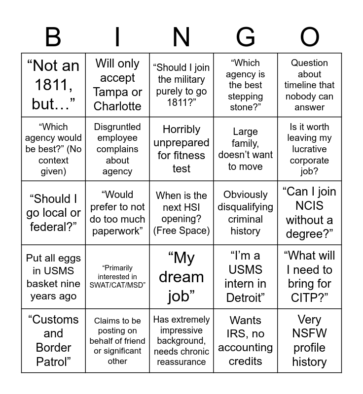 This bingo card has a free space and 24 words: “Primarily interested in SWAT/CAT/MSD”, Claims to be posting on behalf of friend or significant other, Horribly unprepared for fitness test, “Customs and Border Patrol”, Question about timeline that nobody can answer, “Not an 1811, but…”, “Which agency would be best?” (No context given), Will only accept Tampa or Charlotte, Obviously disqualifying criminal history, “My dream job”, Large family, doesn’t want to move, “Should I go local or federal?”, “I’m a USMS intern in Detroit”, “What will I need to bring for CITP?”, Disgruntled employee complains about agency, Wants IRS, no accounting credits, “Can I join NCIS without a degree?”, “Should I join the military purely to go 1811?”, Is it worth leaving my lucrative corporate job?, “Would prefer to not do too much paperwork”, Very NSFW profile history, Put all eggs in USMS basket nine years ago, “Which agency is the best stepping stone?” and Has extremely impressive background, needs chronic reassurance.