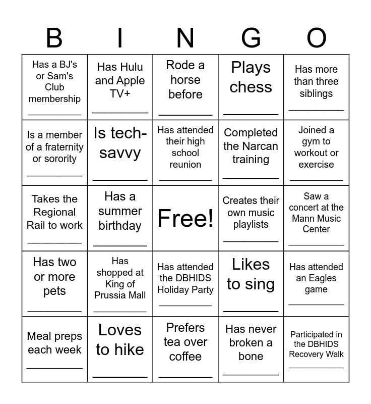This bingo card has a free space and 24 words: Has shopped at King of Prussia Mall __________, Loves to hike ______, Has attended their high school reunion __________, Meal preps each week _________, Has more than three siblings __________, Has a BJ's or Sam's Club membership __________, Is a member of a fraternity or sorority __________, Has Hulu and Apple TV+ _________, Creates their own music playlists __________, Has attended the DBHIDS Holiday Party __________, Completed the Narcan training _________, Takes the Regional Rail to work _________, Likes to sing ______, Has attended an Eagles game ___________, Is tech-savvy ______, Has never broken a bone _________, Saw a concert at the Mann Music Center ___________, Rode a horse before ________, Joined a gym to workout or exercise __________, Has a summer birthday ________, Participated in the DBHIDS Recovery Walk ____________, Has two or more pets ________, Plays chess ______ and Prefers tea over coffee ________.