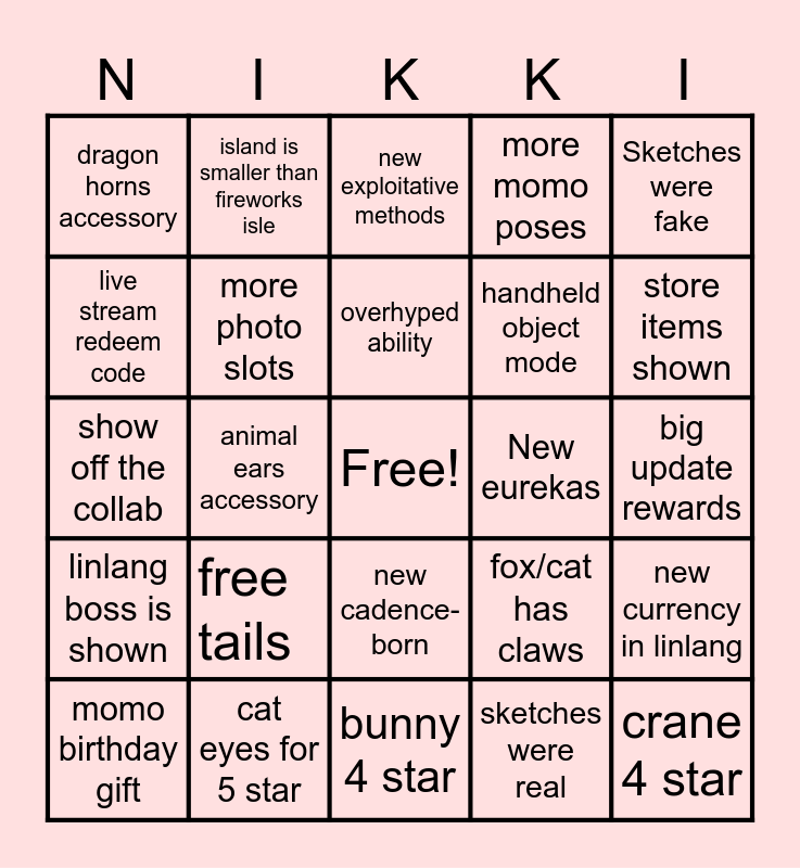 This bingo card has a free space and 24 words: free tails, cat eyes for 5 star, overhyped ability, momo birthday gift, Sketches were fake, dragon horns accessory, live stream redeem code, island is smaller than fireworks isle, New eurekas, new cadence- born, handheld object mode, show off the collab, fox/cat has claws, new currency in linlang, more photo slots, sketches were real, big update rewards, new exploitative methods, store items shown, animal ears accessory, crane 4 star, linlang boss is shown, more momo poses and bunny 4 star.