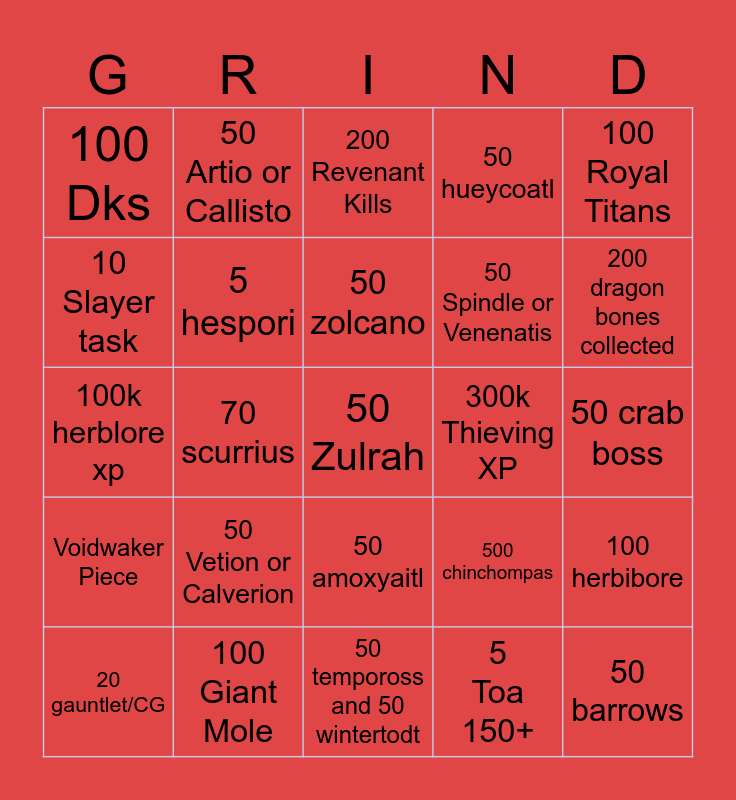 This bingo card has 25 words: Voidwaker Piece, 100 Giant Mole, 50 Zulrah, 5 Toa 150+, 100 Royal Titans, 100 Dks, 50 Artio or Callisto, 200 Revenant Kills, 300k Thieving XP, 100 herbibore, 10 Slayer task, 5 hespori, 50 tempoross and 50 wintertodt, 500 chinchompas, 200 dragon bones collected, 20 gauntlet/CG, 70 scurrius, 50 zolcano, 50 Spindle or Venenatis, 50 crab boss, 100k herblore xp, 50 Vetion or Calverion, 50 amoxyaitl, 50 hueycoatl and 50 barrows.
