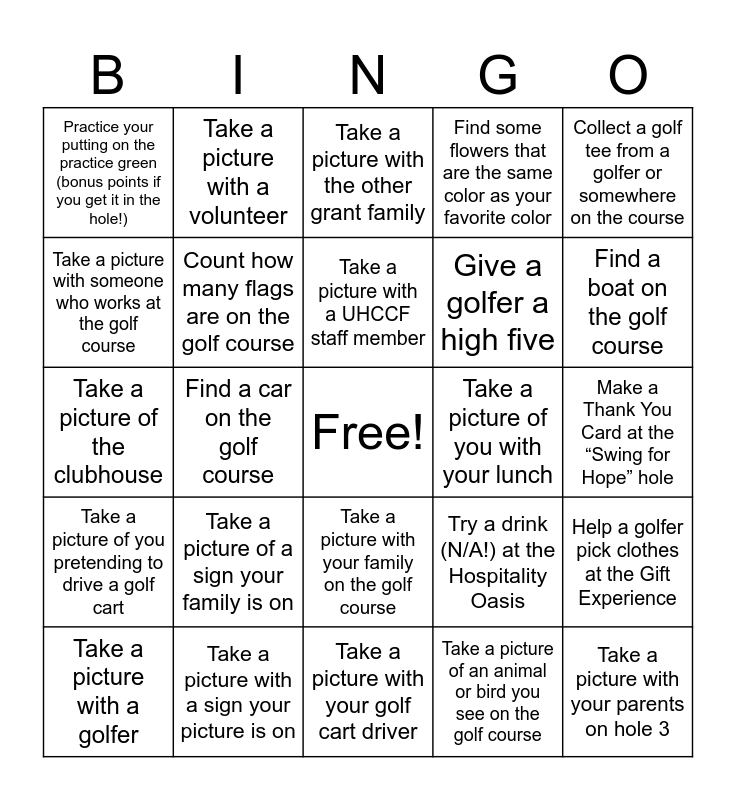 This bingo card has a free space and 24 words: Take a picture of a sign your family is on, Take a picture with a sign your picture is on, Take a picture with a UHCCF staff member, Take a picture with a golfer, Collect a golf tee from a golfer or somewhere on the course, Practice your putting on the practice green (bonus points if you get it in the hole!), Take a picture with someone who works at the golf course, Take a picture with a volunteer, Take a picture of you with your lunch, Take a picture with your family on the golf course, Give a golfer a high five, Take a picture of the clubhouse, Try a drink (N/A!) at the Hospitality Oasis, Help a golfer pick clothes at the Gift Experience, Count how many flags are on the golf course, Take a picture of an animal or bird you see on the golf course, Make a Thank You Card at the “Swing for Hope” hole, Take a picture with the other grant family, Find a boat on the golf course, Find a car on the golf course, Take a picture with your parents on hole 3, Take a picture of you pretending to drive a golf cart, Find some flowers that are the same color as your favorite color and Take a picture with your golf cart driver.