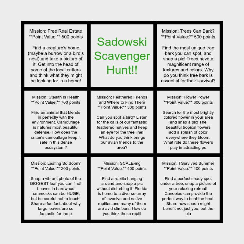 This bingo card has 9 words: Mission: Leafing So Soon? **Point Value:** 200 points Snap a vibrant photo of the BIGGEST leaf you can find! Leaves in hardwood hammocks can be HUGE, but be careful not to touch! Share a fun fact about why large leaves are so fantastic for the p, Mission: Feathered Friends and Where to Find Them **Point Value:** 300 points Can you spot a bird? Listen for the calls of our fantastic feathered natives and keep an eye for the tree line! What do you think brings our avian friends to the area?, Mission: Trees Can Bark? **Point Value:** 500 points Find the most unique tree bark you can spot, and snap a pic! Trees have a magnificent range of textures and colors. Why do you think tree bark is essential for their survival?, Mission: Free Real Estate **Point Value:** 500 points Find a creature’s home (maybe a burrow or a bird’s nest) and take a picture of it. Get into the head of some of the local critters and think what they might be looking for in a home!, Sadowski Scavenger Hunt!!, Mission: Flower Power **Point Value:** 600 points Search for the most brightly colored flower in your area and snap a pic! The beautiful tropical flowers add a splash of color everywhere they bloom. What role do these flowers play in attracting po, Mission: Stealth Is Health **Point Value:** 700 points Find an animal that blends in perfectly with the environment. Camouflage is natures most beautiful defense. How does the critter's camouflage keep it safe in this dense ecosystem?, Mission: SCALE-ing **Point Value:** 400 points Find a reptile hanging around and snap a pic without disturbing it! Florida is home to a diverse array of invasive and native reptiles and many of them are avid climbers. How do you think these reptil and Mission: I Survived Summer **Point Value:** 400 points Find a perfect shady spot under a tree, snap a picture of your relaxing retreat! Canopies can provide the perfect way to beat the heat. Share how shade might benefit not just you, but the pla.