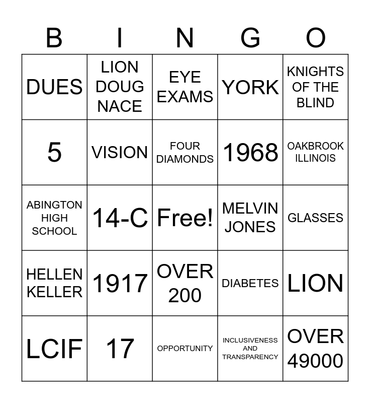 This bingo card has a free space and 29 words: LCIF, LEOS, 14-C, WE SERVE, DUES, EYE EXAMS, VISION, 1917, MELVIN JONES, 17, GLASSES, OVER 49000, OPPORTUNITY, INCLUSIVENESS AND TRANSPARENCY, OAKBROOK ILLINOIS, INSURANCE AGENT, OVER 200, HELLEN KELLER, KNIGHTS OF THE BLIND, ABINGTON HIGH SCHOOL, DIABETES, 43, 1968, 5, YORK, LION DOUG NACE, LION, FOUR DIAMONDS and DISASTER RELIEF.