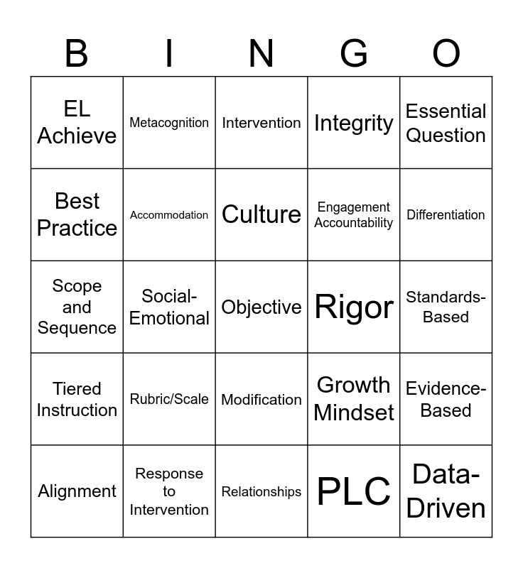 This bingo card has 30 words: Response to Intervention, IEP/504, Social-Emotional, Fidelity, EL Achieve, Intervention, Accommodation, Modification, Rigor, Relationships, Standards-Based, Objective, PLC, Data-Driven, Differentiation, Your Why, Growth Mindset, Tiered Instruction, Rubric/Scale, Essential Question, Scope and Sequence, DOK/Blooms, Metacognition, Engagement Accountability, Best Practice, Integrity, Evidence-Based, Alignment, Culture and Climate.