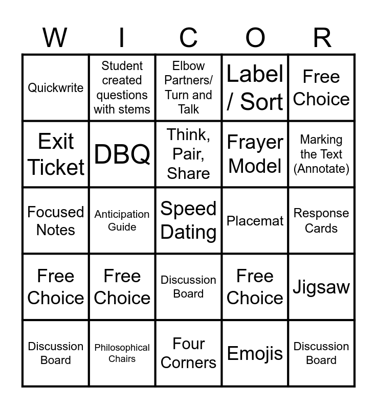 This bingo card has 39 words: GIST Summary, Parking Lot, Give one, Get one, Placemat, Discussion Board, Free Choice, DBQ, Gallery Walk, Frayer Model, Response Cards, Exit Ticket, Student created questions with stems, Speed Dating, Color Code Notes, Marking the Text (Annotate), Focused Notes, Philosophical Chairs, Elbow Partners/ Turn and Talk, Graphic Organizer, Jigsaw, Quickwrite, Anticipation Guide, Think, Pair, Share, Free Choice, Socratic Seminar, Whiteboard Responses, Free Choice, Four Corners, Fist to Five, Free Choice, Parking Lot, Discussion Board, Label / Sort, 3-2-1, Discussion Board, Thumbs Up / Thumbs Down, Sit Down / Stand Up, Emojis and Traffic Lights.