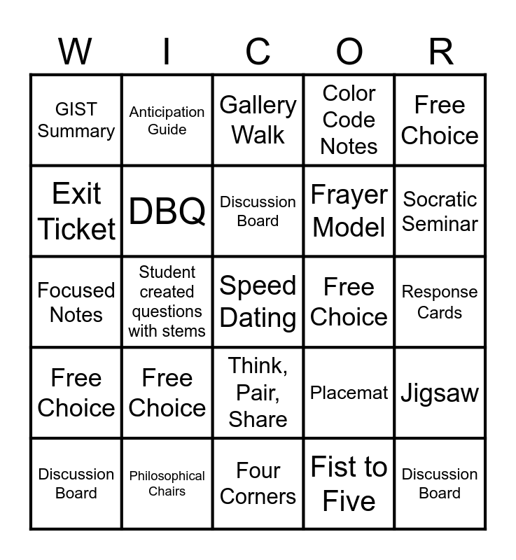 This bingo card has 39 words: Quick Write, Parking Lot, Give one, Get one, Free Choice, Discussion Board, Free Choice, DBQ, Elbow Partners / Turn and Talk, Frayer Model, Response Cards, Exit Ticket, Anticipation Guide, Speed Dating, Label / Sort, Socratic Seminar, Focused Notes, Philosophical Chairs, Gallery Walk, Graphic Organizer, Jigsaw, GIST Summary, Student created questions with stems, Discussion Board, Placemat, Marking the Text (Annotate), Parking Lot, Free Choice, Four Corners, Emojis, Free Choice, Whiteboard Responses, Think, Pair, Share, Color Code Notes, 3-2-1, Discussion Board, Thumbs Up / Thumbs Down, Sit Down / Stand Up, Fist to Five and Traffic Lights.