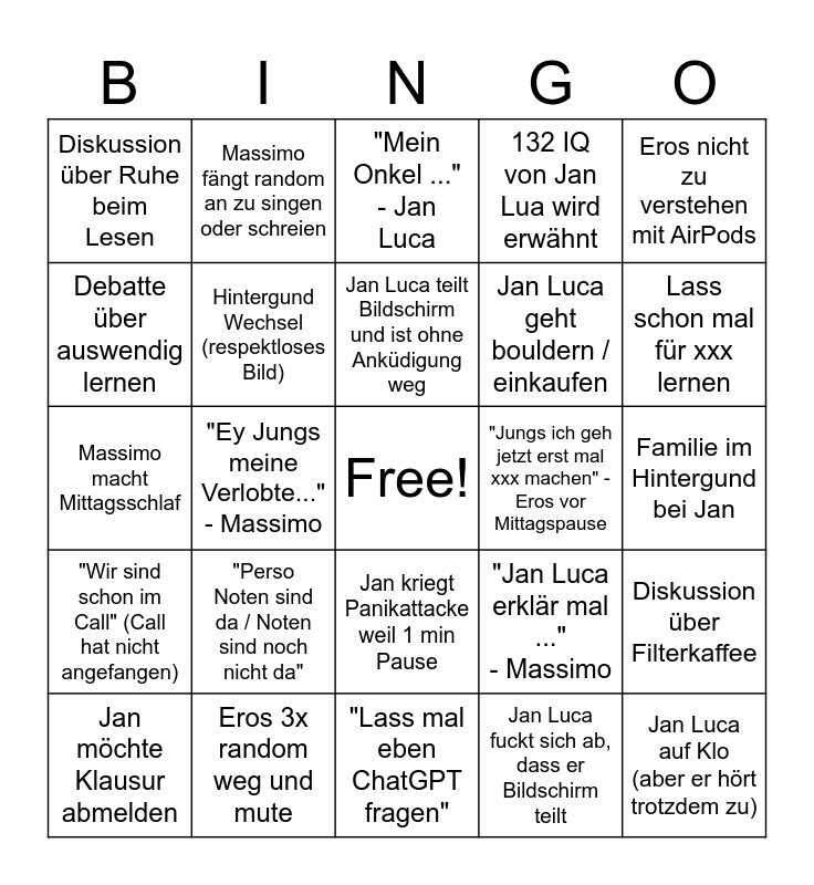 This bingo card has a free space and 24 words: "Perso Noten sind da / Noten sind noch nicht da", Eros 3x random weg und mute, Jan Luca teilt Bildschirm und ist ohne Anküdigung weg, Jan möchte Klausur abmelden, Eros nicht zu verstehen mit AirPods, Diskussion über Ruhe beim Lesen, Debatte über auswendig lernen, Massimo fängt random an zu singen oder schreien, "Jungs ich geh jetzt erst mal xxx machen" - Eros vor Mittagspause, Jan kriegt Panikattacke weil 1 min Pause, Jan Luca geht bouldern / einkaufen, Massimo macht Mittagsschlaf, "Jan Luca erklär mal ..." - Massimo, Diskussion über Filterkaffee, Hintergund Wechsel (respektloses Bild), Jan Luca fuckt sich ab, dass er Bildschirm teilt, Familie im Hintergund bei Jan, "Mein Onkel ..." - Jan Luca, Lass schon mal für xxx lernen, "Ey Jungs meine Verlobte..." - Massimo, Jan Luca auf Klo (aber er hört trotzdem zu), "Wir sind schon im Call" (Call hat nicht angefangen), 132 IQ von Jan Lua wird erwähnt and "Lass mal eben ChatGPT fragen".