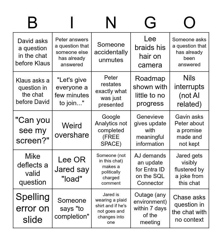 This bingo card has a free space and 24 words: Lee OR Jared say "load", Someone says "to completion", Peter restates exactly what was just presented, Spelling error on slide, Someone asks a question that has already been answered, David asks a question in the chat before Klaus, Klaus asks a question in the chat before David, Peter answers a question that someone else has already answered, Genevieve gives update with meaningful information, Someone (not in this chat) makes a politically charged comment, Roadmap shown with little to no progress, "Can you see my screen?", AJ demands an update for Entra ID on the SQL Connector, Jared gets visibly flustered by a joke from this chat, "Let's give everyone a few minutes to join...", Outage (any environment) within 7 days of the meeting, Gavin asks Peter about a promise made and not kept, Someone accidentally unmutes, Nils interrupts (not AI related), Weird overshare, Chase asks question in the chat with no context, Mike deflects a valid question, Lee braids his hair on camera and Jared is wearing a plaid shirt and if he's not goes and changes into one.
