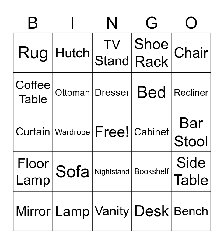 This bingo card has a free space and 24 words: Sofa, Lamp, Dresser, Mirror, Chair, Rug, Coffee Table, Hutch, Cabinet, Nightstand, Bed, Curtain, Bookshelf, Side Table, Ottoman, Desk, Bar Stool, TV Stand, Recliner, Wardrobe, Bench, Floor Lamp, Shoe Rack and Vanity.