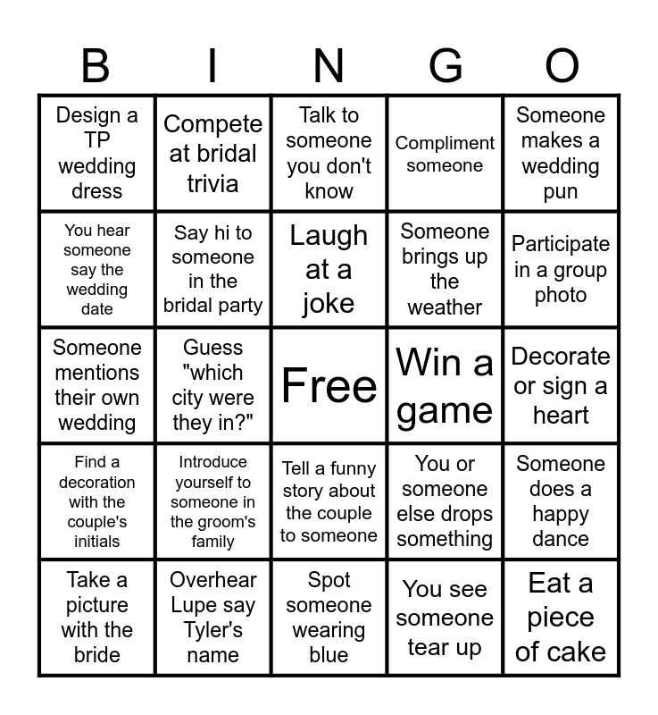 This bingo card has a free space and 29 words: Take a picture with the bride, Write down a date night idea for the couple, Guess "which city were they in?", Win rock-paper-scissors against another guest, Design a TP wedding dress, Talk to someone you don't know, Say hi to someone in the bridal party, Introduce yourself to someone in the groom's family, Win a game, Overhear Lupe say Tyler's name, Decorate or sign a heart, Eat a piece of cake, Spot someone wearing blue, You see someone tear up, Participate in a group photo, Pin a clothespin on Lupe without her noticing, Tell a funny story about the couple to someone, Find a decoration with the couple's initials, Someone makes a wedding pun, Someone mentions their own wedding, You or someone else drops something, Someone says "it's not the heat, it's the humidity", Someone brings up the weather, You hear someone say the wedding date, Compliment someone, Compete at bridal trivia, Someone does a happy dance, Laugh at a joke and Someone wears something unexpected.