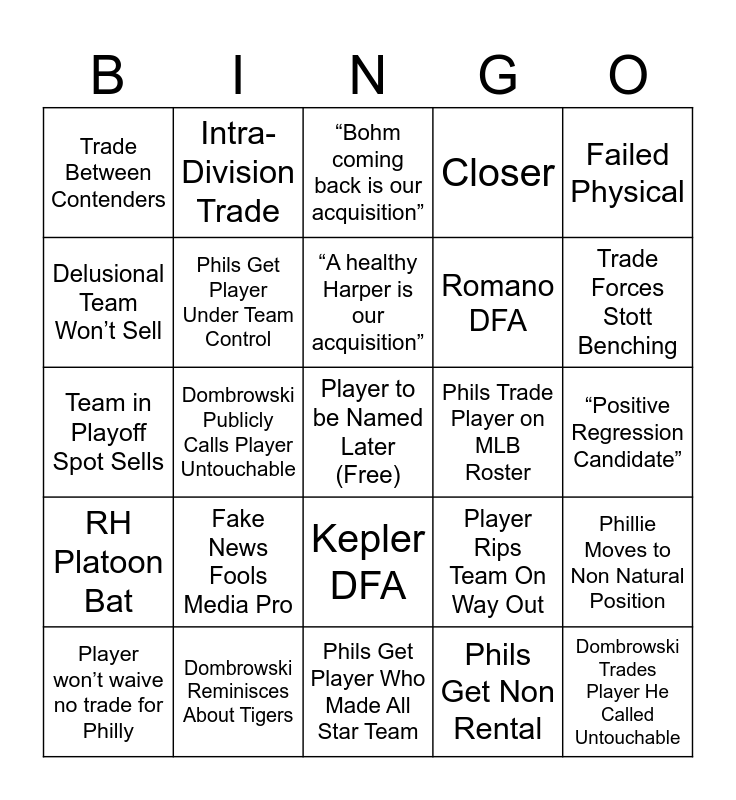 This bingo card has a free space and 24 words: Fake News Fools Media Pro, Dombrowski Reminisces About Tigers, “A healthy Harper is our acquisition”, Player won’t waive no trade for Philly, Failed Physical, Trade Between Contenders, Delusional Team Won’t Sell, Intra-Division Trade, Phils Trade Player on MLB Roster, Kepler DFA, Romano DFA, Team in Playoff Spot Sells, Player Rips Team On Way Out, Phillie Moves to Non Natural Position, Phils Get Player Under Team Control, Phils Get Non Rental, “Positive Regression Candidate”, “Bohm coming back is our acquisition”, Trade Forces Stott Benching, Dombrowski Publicly Calls Player Untouchable, Dombrowski Trades Player He Called Untouchable, RH Platoon Bat, Closer and Phils Get Player Who Made All Star Team.