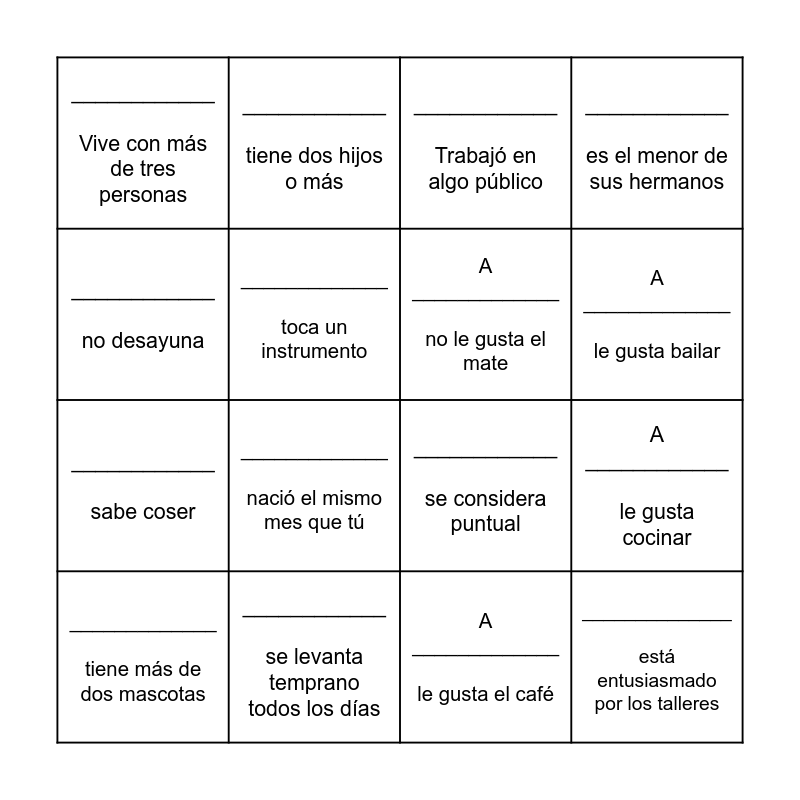This bingo card has 16 words: ____________ se levanta temprano todos los días, A ____________ le gusta cocinar, ____________ Trabajó en algo público, ____________ Vive con más de tres personas, ____________ sabe coser, ____________ tiene dos hijos o más, ____________ se considera puntual, A _____________ le gusta el café, ____________ no desayuna, _____________ toca un instrumento, _____________ tiene más de dos mascotas, ____________ es el menor de sus hermanos, _____________ nació el mismo mes que tú, A _____________ le gusta bailar, A _____________ no le gusta el mate and ______________ está entusiasmado por los talleres.