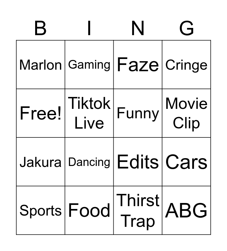 This bingo card has 16 words: Food, Cars, Faze, Marlon, Jakura, Gaming, Edits, Thirst Trap, Free!, Tiktok Live, Sports, Cringe, Dancing, Movie Clip, Funny and ABG.