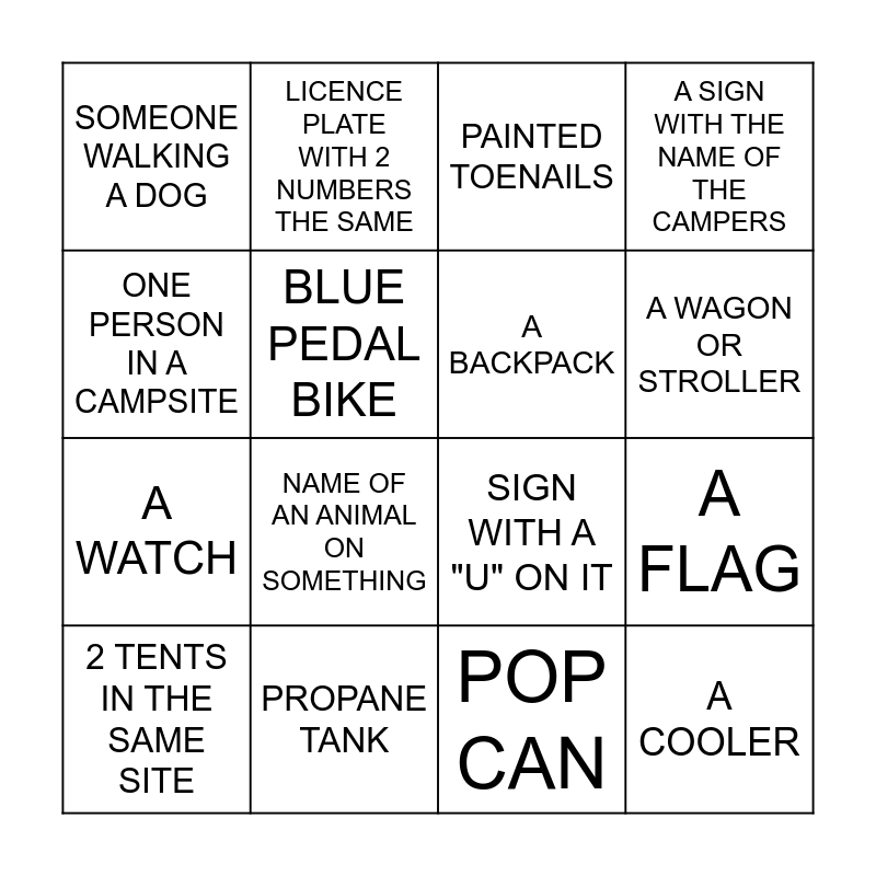 This bingo card has 16 words: PROPANE TANK, A FLAG, PAINTED TOENAILS, SOMEONE WALKING A DOG, A WATCH, LICENCE PLATE WITH 2 NUMBERS THE SAME, SIGN WITH A "U" ON IT, POP CAN, ONE PERSON IN A CAMPSITE, BLUE PEDAL BIKE, 2 TENTS IN THE SAME SITE, A SIGN WITH THE NAME OF THE CAMPERS, NAME OF AN ANIMAL ON SOMETHING, A WAGON OR STROLLER, A BACKPACK and A COOLER.