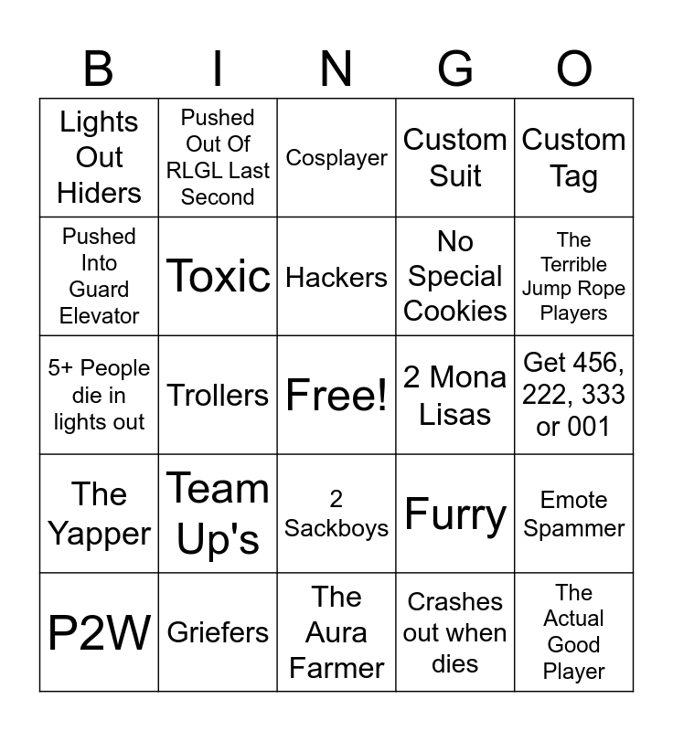 This bingo card has a free space and 24 words: Team Up's, Griefers, Hackers, P2W, Custom Tag, Lights Out Hiders, Pushed Into Guard Elevator, Pushed Out Of RLGL Last Second, 2 Mona Lisas, 2 Sackboys, No Special Cookies, 5+ People die in lights out, Furry, Emote Spammer, Toxic, Crashes out when dies, Get 456, 222, 333 or 001, Cosplayer, The Terrible Jump Rope Players, Trollers, The Actual Good Player, The Yapper, Custom Suit and The Aura Farmer.
