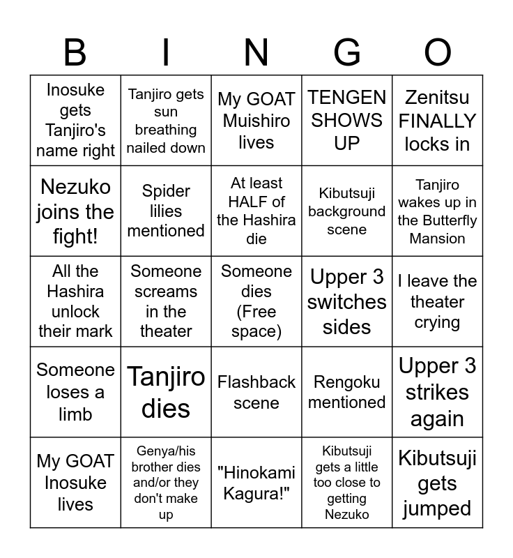 This bingo card has a free space and 24 words: Tanjiro dies, Genya/his brother dies and/or they don't make up, At least HALF of the Hashira die, My GOAT Inosuke lives, Zenitsu FINALLY locks in, Inosuke gets Tanjiro's name right, Nezuko joins the fight!, Tanjiro gets sun breathing nailed down, Upper 3 switches sides, Flashback scene, Kibutsuji background scene, All the Hashira unlock their mark, Rengoku mentioned, Upper 3 strikes again, Spider lilies mentioned, Kibutsuji gets a little too close to getting Nezuko, I leave the theater crying, My GOAT Muishiro lives, Tanjiro wakes up in the Butterfly Mansion, Someone screams in the theater, Kibutsuji gets jumped, Someone loses a limb, TENGEN SHOWS UP and "Hinokami Kagura!".