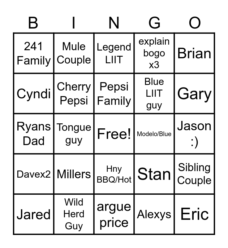 This bingo card has a free space and 24 words: Millers, Wild Herd Guy, Pepsi Family, Jared, Brian, 241 Family, Cyndi, Mule Couple, Modelo/Blue, Hny BBQ/Hot, Blue LIIT guy, Ryans Dad, Stan, Sibling Couple, Cherry Pepsi, Alexys, Jason :), Legend LIIT, Gary, Tongue guy, Eric, Davex2, explain bogo x3 and argue price.