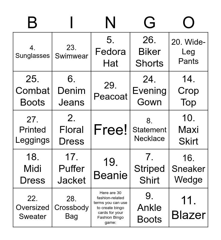 This bingo card has a free space and 31 words: Here are 30 fashion-related terms you can use to create bingo cards for your Fashion Bingo game:, 1. High Heels, 2. Floral Dress, 3. Leather Jacket, 4. Sunglasses, 5. Fedora Hat, 6. Denim Jeans, 7. Striped Shirt, 8. Statement Necklace, 9. Ankle Boots, 10. Maxi Skirt, 11. Blazer, 12. Graphic Tee, 13. Choker Necklace, 14. Crop Top, 15. Tailored Trousers, 16. Sneaker Wedge, 17. Puffer Jacket, 18. Midi Dress, 19. Beanie, 20. Wide-Leg Pants, 21. Scarf, 22. Oversized Sweater, 23. Swimwear, 24. Evening Gown, 25. Combat Boots, 26. Biker Shorts, 27. Printed Leggings, 28. Crossbody Bag, 29. Peacoat and 30. Vintage Handbag.