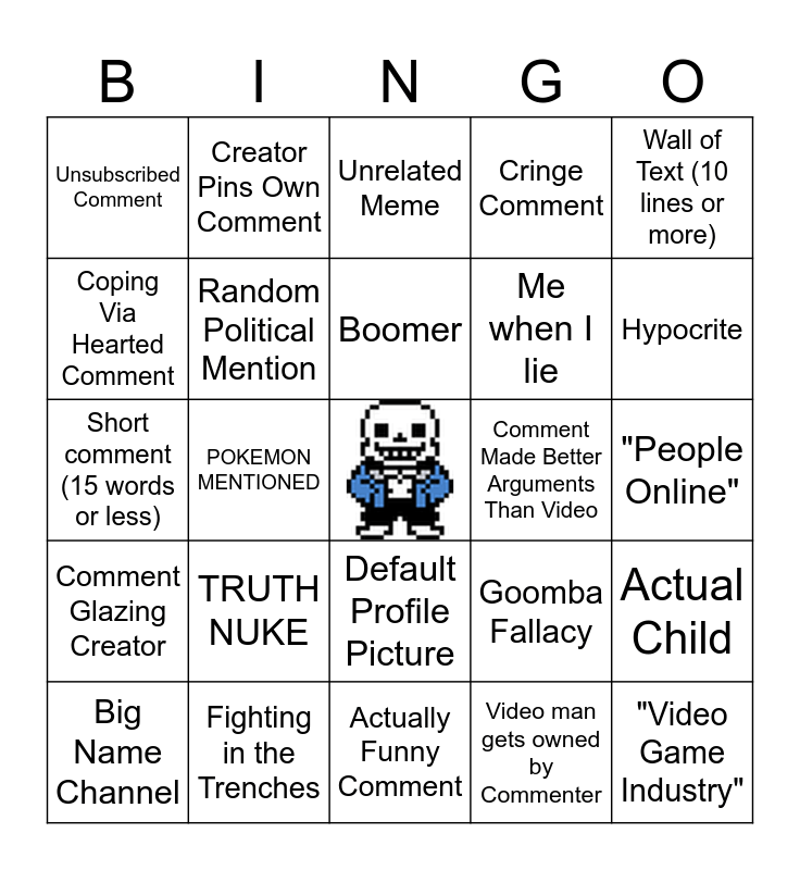 This bingo card has a free space and 24 words: TRUTH NUKE, Fighting in the Trenches, Boomer, Big Name Channel, Wall of Text (10 lines or more), Unsubscribed Comment, Coping Via Hearted Comment, Creator Pins Own Comment, Comment Made Better Arguments Than Video, Default Profile Picture, Me when I lie, Short comment (15 words or less), Goomba Fallacy, Actual Child, Random Political Mention, Video man gets owned by Commenter, "People Online", Unrelated Meme, Hypocrite, POKEMON MENTIONED, "Video Game Industry", Comment Glazing Creator, Cringe Comment and Actually Funny Comment.
