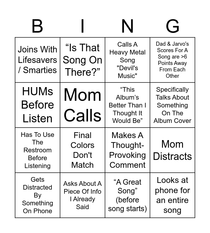 This bingo card has 21 words: Asks About A Piece Of Info I Already Said, Final Scores Tie, “Is That Song On There?”, “This Is A Long Song” (> 7 min.), “A Great Song” (before song starts), “This Album’s Better Than I Thought It Would Be”, Joins With Lifesavers / Smarties, Calls A Heavy Metal Song "Devil's Music", Makes A Thought-Provoking Comment, Specifically Talks About Something On The Album Cover, Has To Use The Restroom Before Listening, Dad & Jarvo's Scores For A Song are >6 Points Away From Each Other, Looks at phone for an entire song, Ben Calls, Mom Calls, The Dreaded HUM, Gets Distracted By Something On Phone, Final Colors Don't Match, HUMs Before Listen, Mom Distracts and Grandmom/ Grandad Call.