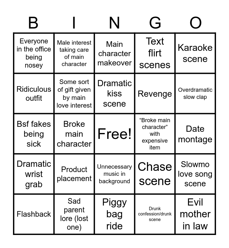 This bingo card has a free space and 29 words: Flashback, Accident event plot, Broke main character, Rich new love interest, Everyone in the office being nosey, Main character makeover, Some sort of gift given by main love interest, Product placement, “Broke main character” with expensive item, Sad parent lore (lost one), Date montage, Evil mother in law, Piggy bag ride, Drunk confession/drunk scene, Overdramatic slow clap, Entrance scene, Unnecessary music in background, Dramatic wrist grab, Karaoke scene, Bsf fakes being sick, Chase scene, Rain scene, Revenge, Ridiculous outfit, Text flirt scenes, Male interest taking care of main character, Slowmo love song scene, Dramatic kiss scene and Caught staring.