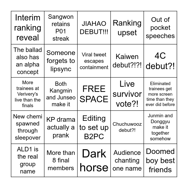 This bingo card has a free space and 24 words: ALD1 is the real group name, KP drama actually a prank, Viral tweet escapes containment, Audience chanting one name, Out of pocket speeches, Interim ranking reveal, Sangwon retains P01 streak, JIAHAO DEBUT!!!, Live survivor vote?!, Eliminated trainees get more screen time than they ever did before, More trainees at Verivery's live than the finals, Someone forgets to lipsync, Chuchuwooz debut?!, Junmin and Donggyu make it together somehow, The ballad also has an alpha concept, More than 8 final members, Dark horse, Ranking upset, 4C debut?!, New chemi spawned through sleepover, Both Kangmin and Junseo make it, Editing to set up B2PC, Kaiwen debut?!?! and Doomed boy best friends.