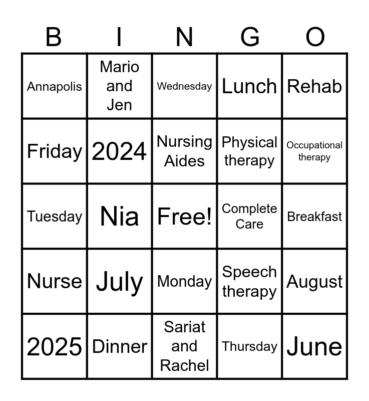 This bingo card has a free space and 24 words: July, Dinner, Nursing Aides, 2025, Rehab, Annapolis, Friday, Mario and Jen, Complete Care, Monday, Physical therapy, Tuesday, Speech therapy, August, 2024, Thursday, Breakfast, Wednesday, Occupational therapy, Nia, June, Nurse, Lunch and Sariat and Rachel.