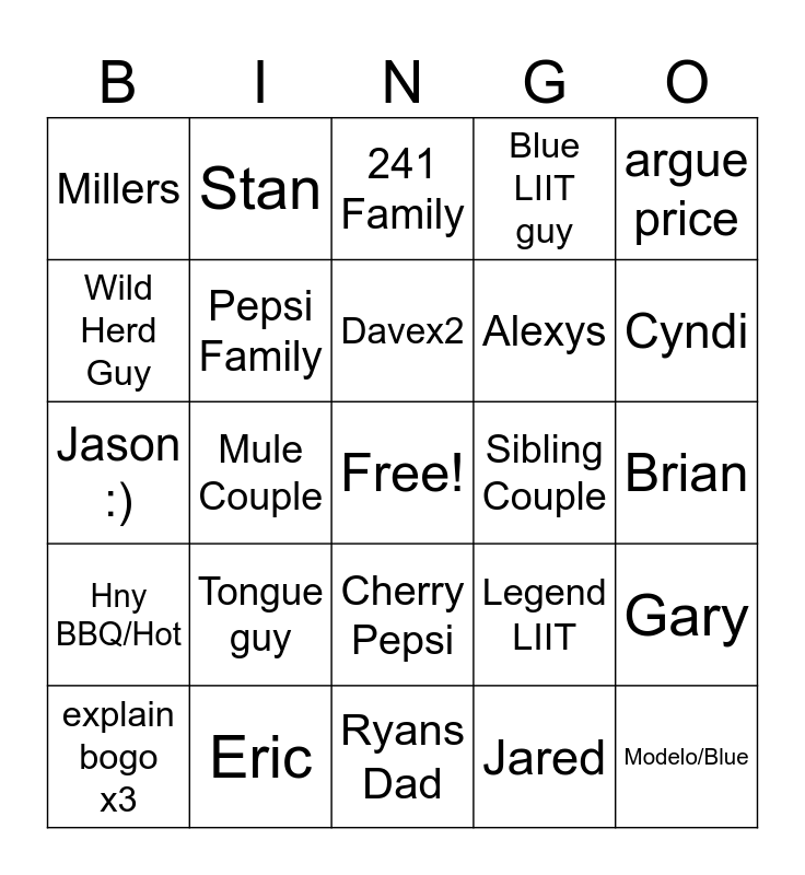 This bingo card has a free space and 24 words: Tongue guy, Eric, Davex2, explain bogo x3, argue price, Millers, Wild Herd Guy, Stan, Sibling Couple, Cherry Pepsi, Alexys, Jason :), Legend LIIT, Gary, Pepsi Family, Jared, Brian, 241 Family, Cyndi, Mule Couple, Modelo/Blue, Hny BBQ/Hot, Blue LIIT guy and Ryans Dad.