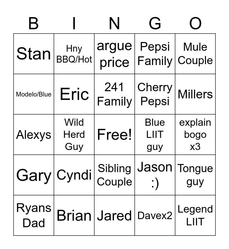 This bingo card has a free space and 24 words: Cyndi, Brian, 241 Family, Ryans Dad, Mule Couple, Stan, Modelo/Blue, Hny BBQ/Hot, Blue LIIT guy, Sibling Couple, Cherry Pepsi, Alexys, Jason :), Tongue guy, Eric, Davex2, explain bogo x3, argue price, Millers, Wild Herd Guy, Legend LIIT, Gary, Pepsi Family and Jared.