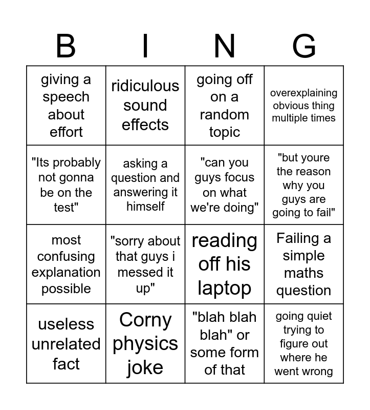 This bingo card has 16 words: Corny physics joke, Failing a simple maths question, going off on a random topic, giving a speech about effort, most confusing explanation possible, ridiculous sound effects, reading off his laptop, "blah blah blah" or some form of that, "Its probably not gonna be on the test", asking a question and answering it himself, useless unrelated fact, overexplaining obvious thing multiple times, "sorry about that guys i messed it up", "but youre the reason why you guys are going to fail", "can you guys focus on what we're doing" and going quiet trying to figure out where he went wrong.