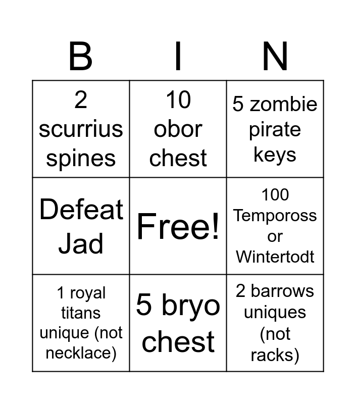 This bingo card has a free space and 8 words: 100 Tempoross or Wintertodt, 5 zombie pirate keys, 10 obor chest, 1 royal titans unique (not necklace), 2 scurrius spines, 2 barrows uniques (not racks), Defeat Jad and 5 bryo chest.