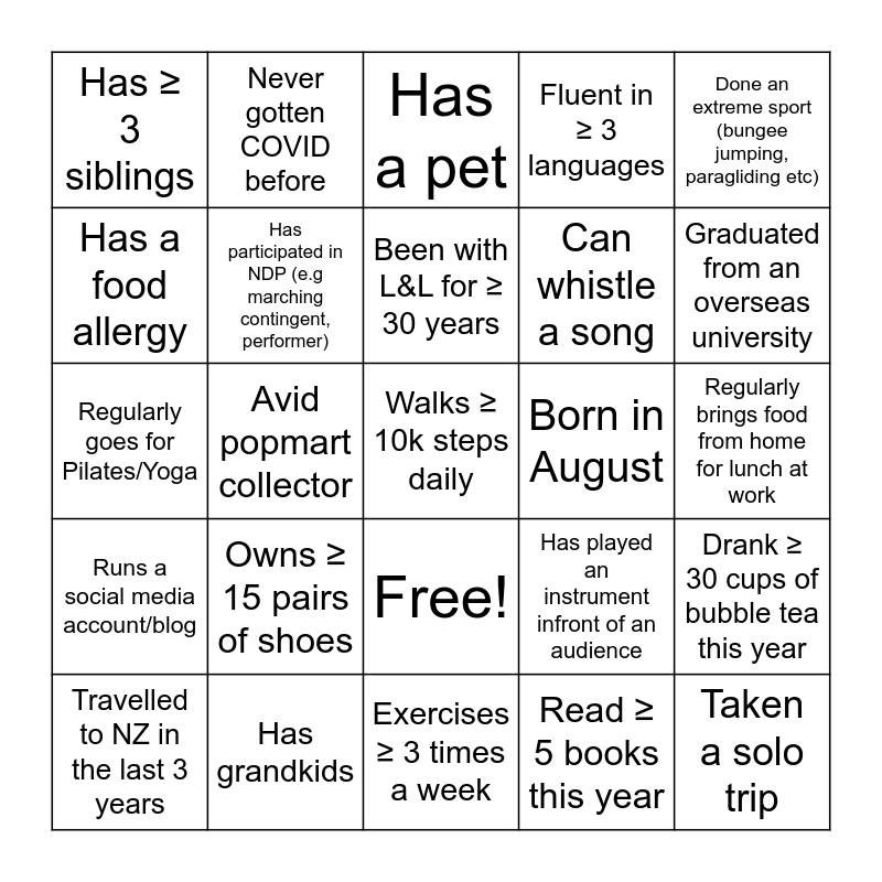 This bingo card has 26 words: Free!, Read ≥ 5 books this year, Been with L&L for ≥ 30 years, Has grandkids, Done an extreme sport (bungee jumping, paragliding etc), Has ≥ 3 siblings, Has a food allergy, Never gotten COVID before, Regularly brings food from home for lunch at work, Has played an instrument infront of an audience, Can whistle a song, Regularly goes for Pilates/Yoga, Drank ≥ 30 cups of bubble tea this year, Travelled to NZ in the last 3 years, Avid popmart collector, Volunteers regularly, Fluent in ≥ 3 languages, Runs a social media account/blog, Has a pet, Walks ≥ 10k steps daily, Graduated from an overseas university, Exercises ≥ 3 times a week, Born in August, Owns ≥ 15 pairs of shoes, Has participated in NDP (e.g marching contingent, performer) and Taken a solo trip.