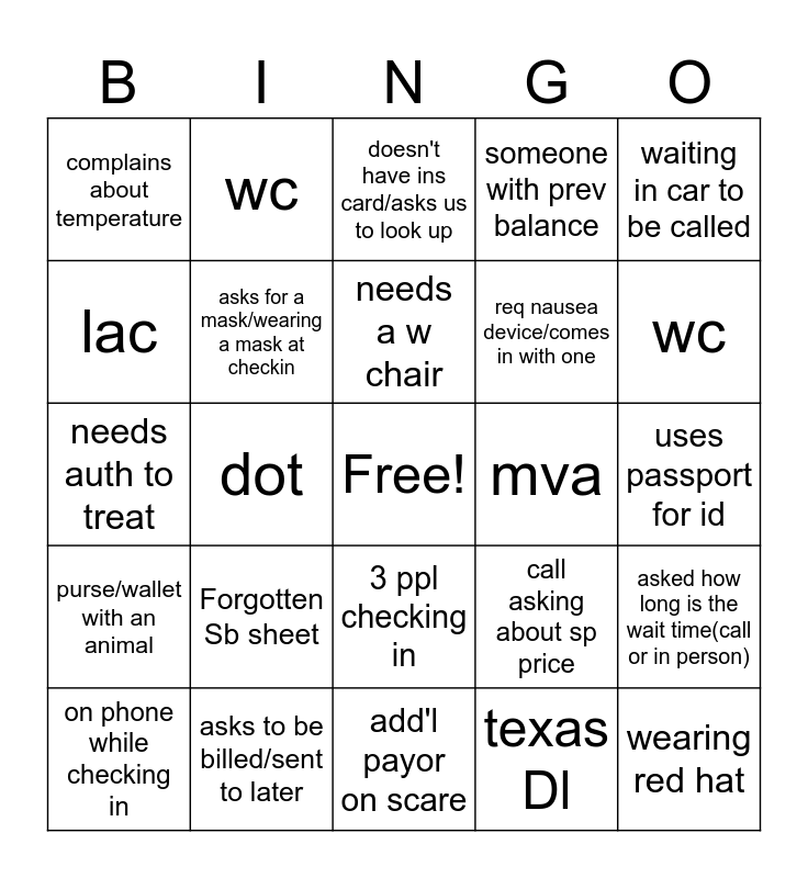 This bingo card has a free space and 24 words: Forgotten Sb sheet, asks to be billed/sent to later, needs a w chair, on phone while checking in, waiting in car to be called, complains about temperature, lac, wc, mva, 3 ppl checking in, req nausea device/comes in with one, needs auth to treat, call asking about sp price, asked how long is the wait time(call or in person), asks for a mask/wearing a mask at checkin, texas Dl, uses passport for id, doesn't have ins card/asks us to look up, wc, dot, wearing red hat, purse/wallet with an animal, someone with prev balance and add'l payor on scare.