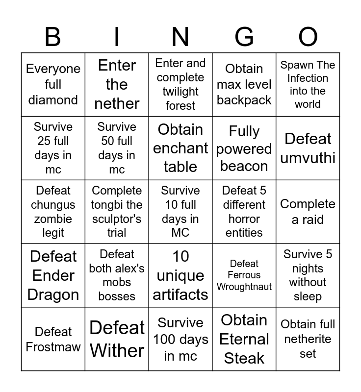 This bingo card has 25 words: Defeat Ender Dragon, Defeat Wither, Survive 10 full days in MC, Obtain Eternal Steak, Spawn The Infection into the world, Everyone full diamond, Enter the nether, Enter and complete twilight forest, Defeat 5 different horror entities, Survive 5 nights without sleep, Survive 25 full days in mc, Survive 50 full days in mc, Survive 100 days in mc, Defeat Ferrous Wroughtnaut, Defeat umvuthi, Defeat Frostmaw, Complete tongbi the sculptor's trial, Obtain enchant table, Fully powered beacon, Complete a raid, Defeat chungus zombie legit, Defeat both alex's mobs bosses, 10 unique artifacts, Obtain max level backpack and Obtain full netherite set.