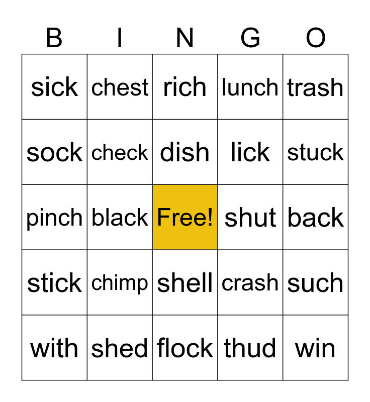 This bingo card has a free space and 44 words: mash, win, kick, with, thump, thud, rich, chin, trash, shed, lunch, shut, shell, chimp, rush, flock, theft, pinch, shift, stuck, chest, luck, snack, sick, Tash, back, duck, fish, crash, stick, bench, such, shelf, thrash, black, flush, inch, shush, dish, sock, lick, neck, check and Beth.