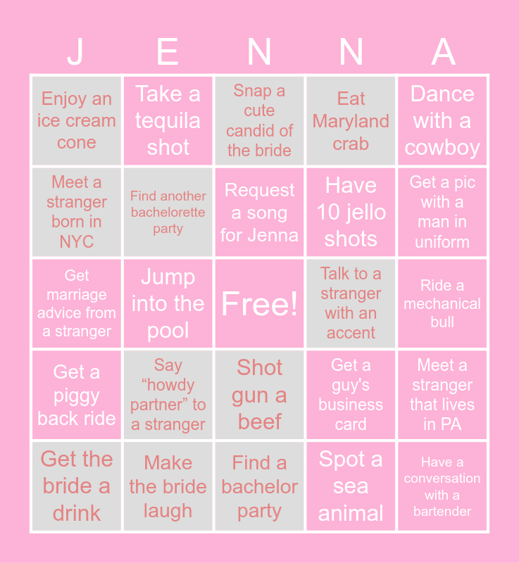 This bingo card has a free space and 33 words: Buy Jenna a drink, Drink some water, Jump into the pool, Take a pic with a guy named John, Get a piggy back ride, Find another bachelorette party, Dance with a cowboy, Get the bride a drink, Take a tequila shot, Get on a stage, Request a song for Jenna, Snap a cute candid of the bride, Share a fun memory of Jen, Make a new friend in the bathroom, Talk to a stranger with an accent, Get a pic with a man in uniform, Make the bride laugh, Get marriage advice from a stranger, Say “howdy partner” to a stranger, Get a guy's business card, Shot gun a beef, Take a selfie with a mustache, Enjoy an ice cream cone, Ride a mechanical bull, Find a bachelor party, Have a conversation with a bartender, Eat Maryland crab, Have 10 jello shots, Meet a stranger born in NYC, Meet a stranger that lives in PA, Wear a sailor hat, Spot a sea animal and Get a pic with a guy named KOB.