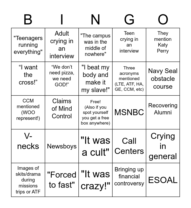 This bingo card has a free space and 29 words: Images of skits/drama during missions trips or ATF, San Francisco Battlecry, Claims of Mind Control, "I want the cross!", "Teenagers running everything", "The campus was in the middle of nowhere", “We don’t need pizza, we need GOD!”, Newsboys, MSNBC, "Forced to fast", Recovering Alumni, ESOAL, "It was crazy!", Bringing up financial controversy, Navy Seal obstacle course, Ron Luce on a tank, "It was a cult", V-necks, They mention Katy Perry, CCM mentioned (WOO represent!), Call Centers, Cultural Appropriation (World Awareness LTE), Three acronyms mentioned (LTE, ATF, HA, GE, CCM, etc), “I want the cross!”, Teen crying in an interview, Adult crying in an interview, Crying in general, "I beat my body and make it my slave!" and Triple bunk beds.