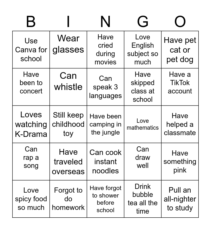 This bingo card has a free space and 24 words: Have traveled overseas, Forgot to do homework, Can speak 3 languages, Love spicy food so much, Have pet cat or pet dog, Use Canva for school, Have been to concert, Wear glasses, Love mathematics, Can cook instant noodles, Have skipped class at school, Loves watching K-Drama, Can draw well, Have something pink, Can whistle, Drink bubble tea all the time, Have helped a classmate, Have cried during movies, Have a TikTok account, Still keep childhood toy, Pull an all-nighter to study, Can rap a song, Love English subject so much and Have forgot to shower before school.