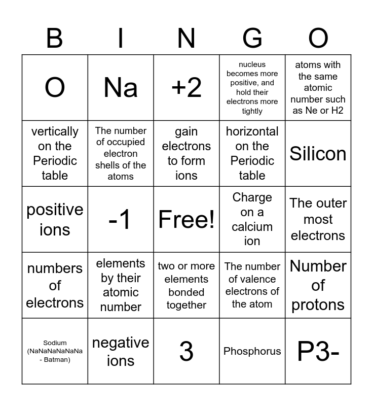 This bingo card has a free space and 31 words: 3, 2, -1, Argon, O, +2, The number of occupied electron shells of the atoms, The number of valence electrons of the atom, Charge on a calcium ion, Phosphorus, The outer most electrons, P3-, Period 2 Main group 5, N-3, Silicon, Hydrogen, Number of protons, elements by their atomic number, numbers of electrons, two or more elements bonded together, atoms with the same atomic number such as Ne or H2, Mixture, Sodium (NaNaNaNaNaNa - Batman), Na, horizontal on the Periodic table, vertically on the Periodic table, nucleus becomes more positive, and hold their electrons more tightly, positive ions, negative ions, gain electrons to form ions and lose electrons to form ions.