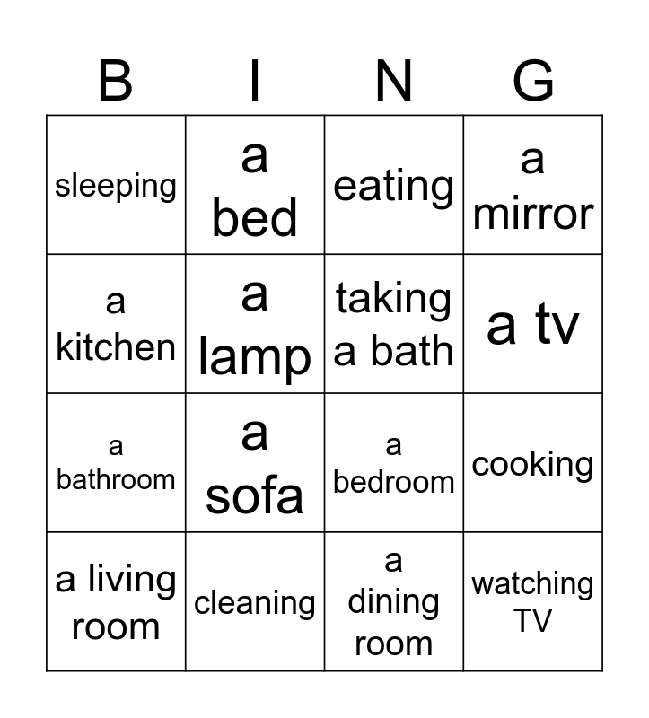 This bingo card has 16 words: cleaning, cooking, eating, sleeping, a bathroom, a bed, a bedroom, a dining room, a kitchen, a lamp, a living room, a mirror, a sofa, a tv, taking a bath and watching TV.