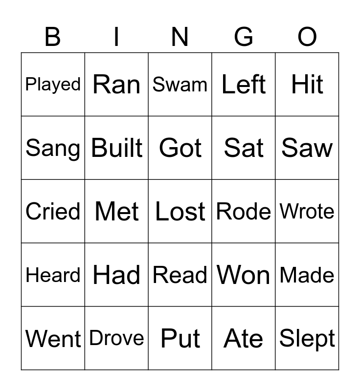 This bingo card has a free space and 24 words: Went, Had, Got, Ate, Hit, Played, Ran, Swam, Rode, Wrote, Cried, Built, Won, Made, Sang, Drove, Put, Left, Saw, Heard, Met, Read, Sat and Slept.