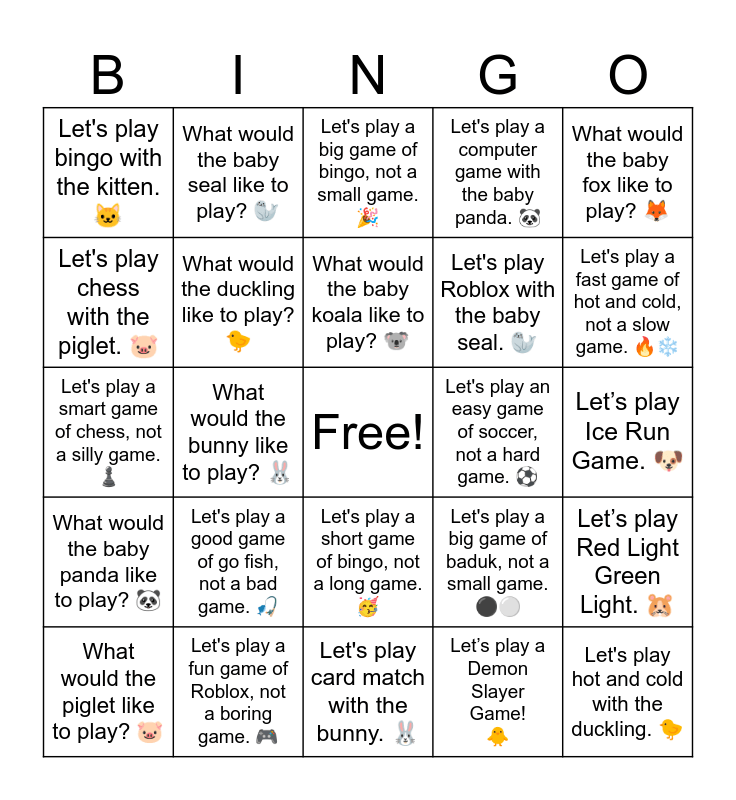 This bingo card has a free space and 33 words: What would the kitten like to play? ๐ฑ, What would the puppy like to play? ๐ถ, What would the bunny like to play? ๐ฐ, What would the hamster like to play? ๐น, What would the baby panda like to play? ๐ผ, What would the duckling like to play? ๐ค, What would the baby fox like to play? ๐ฆ, What would the piglet like to play? ๐ท, What would the baby seal like to play? ๐ฆญ, What would the chick like to play? ๐ฅ, What would the baby koala like to play? ๐จ, Let's play a big game of bingo, not a small game. ๐, Let's play a loud game of basketball, not a quiet game. ๐, Let's play a short game of card match, not a long game. ๐, Let's play an easy game of soccer, not a hard game. โฝ, Let's play a fast game of hot and cold, not a slow game. ๐ฅโ๏ธ, Let's play a fun game of Roblox, not a boring game. ๐ฎ, Let's play a smart game of chess, not a silly game. โ๏ธ, Let's play a good game of go fish, not a bad game. ๐ฃ, Let's play a big game of baduk, not a small game. โซโช, Let's play a short game of bingo, not a long game. ๐ฅณ, Let's play an easy game of a computer game, not a hard game. ๐ป, Let's play bingo with the kitten. ๐ฑ, Letโs play Ice Run Game. ๐ถ, Let's play card match with the bunny. ๐ฐ, Let's play hot and cold with the duckling. ๐ค, Let's play a computer game with the baby panda. ๐ผ, Let's play Roblox with the baby seal. ๐ฆญ, Let's play chess with the piglet. ๐ท, Letโs play Red Light Green Light. ๐น, Let's play baduk with the baby fox. ๐ฆ, Letโs play a Demon Slayer Game! ๐ฅ and Letโs play a Little Friendโs Game. ๐จ.